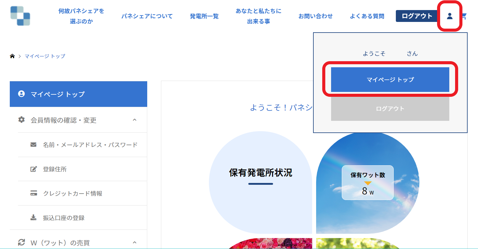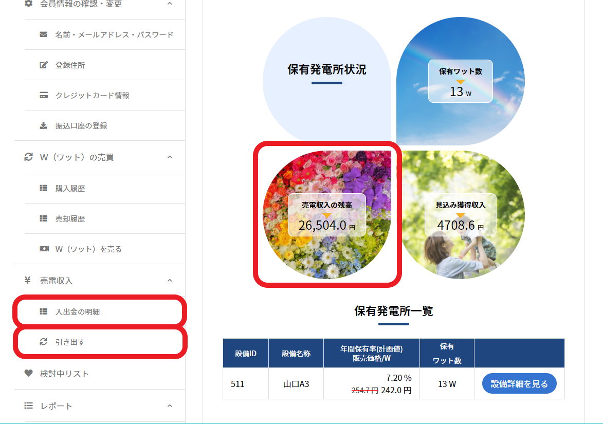 マイページのトップ画面で、現在の売電収入を確認してください。