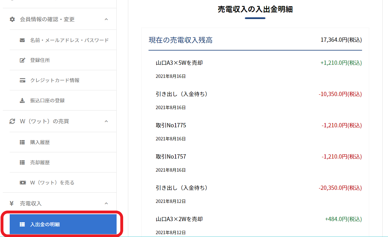 入出金の明細ページに売電収入の入出金の履歴が表示されます。