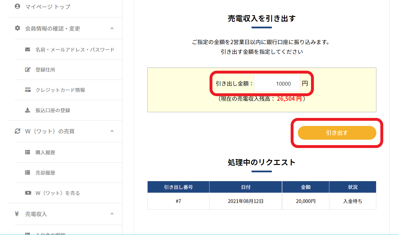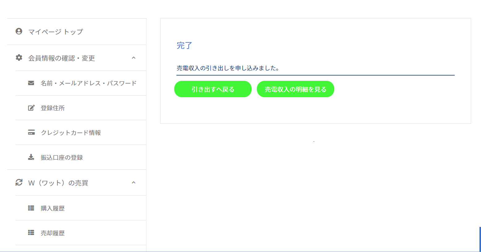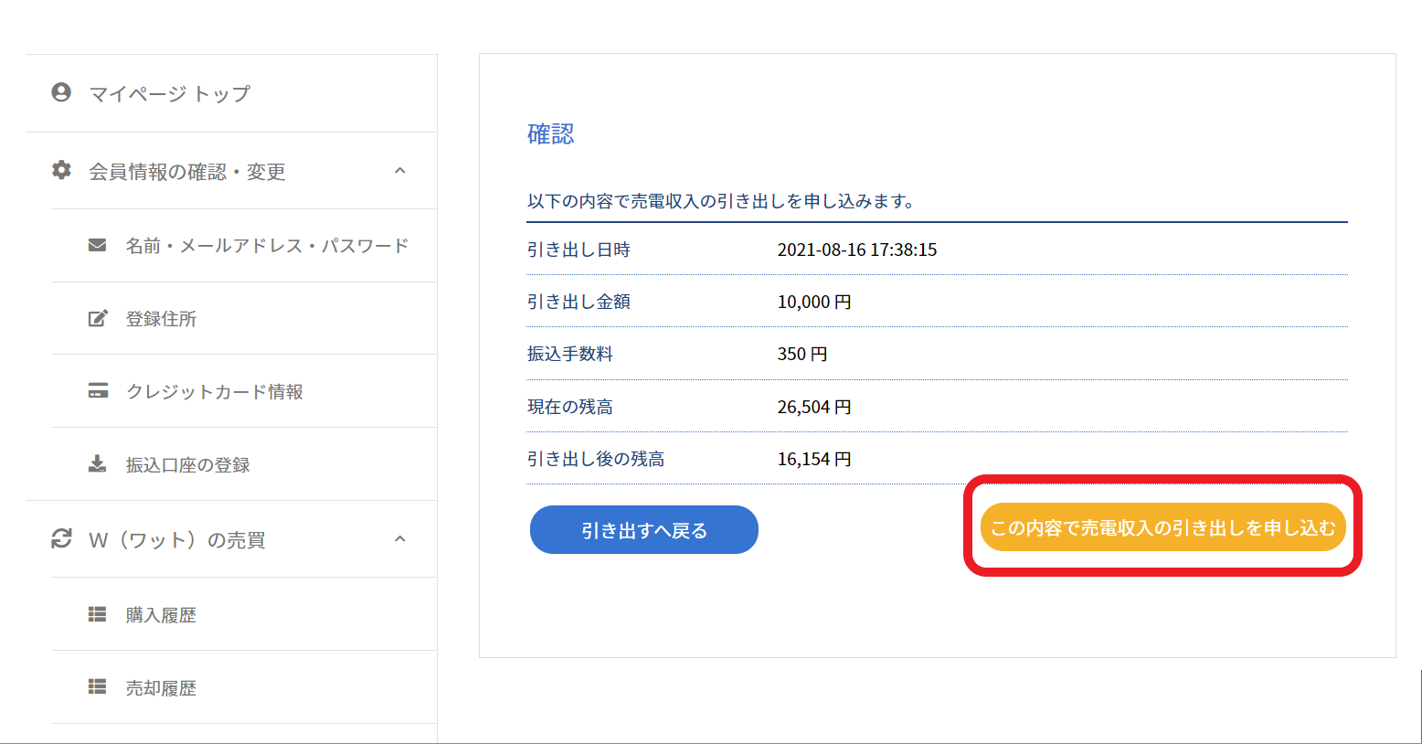 確認ページに表示される内容を確認し、よろしければ「この内容で売電収入の引き出しを申し込む」ボタンをクリックします。